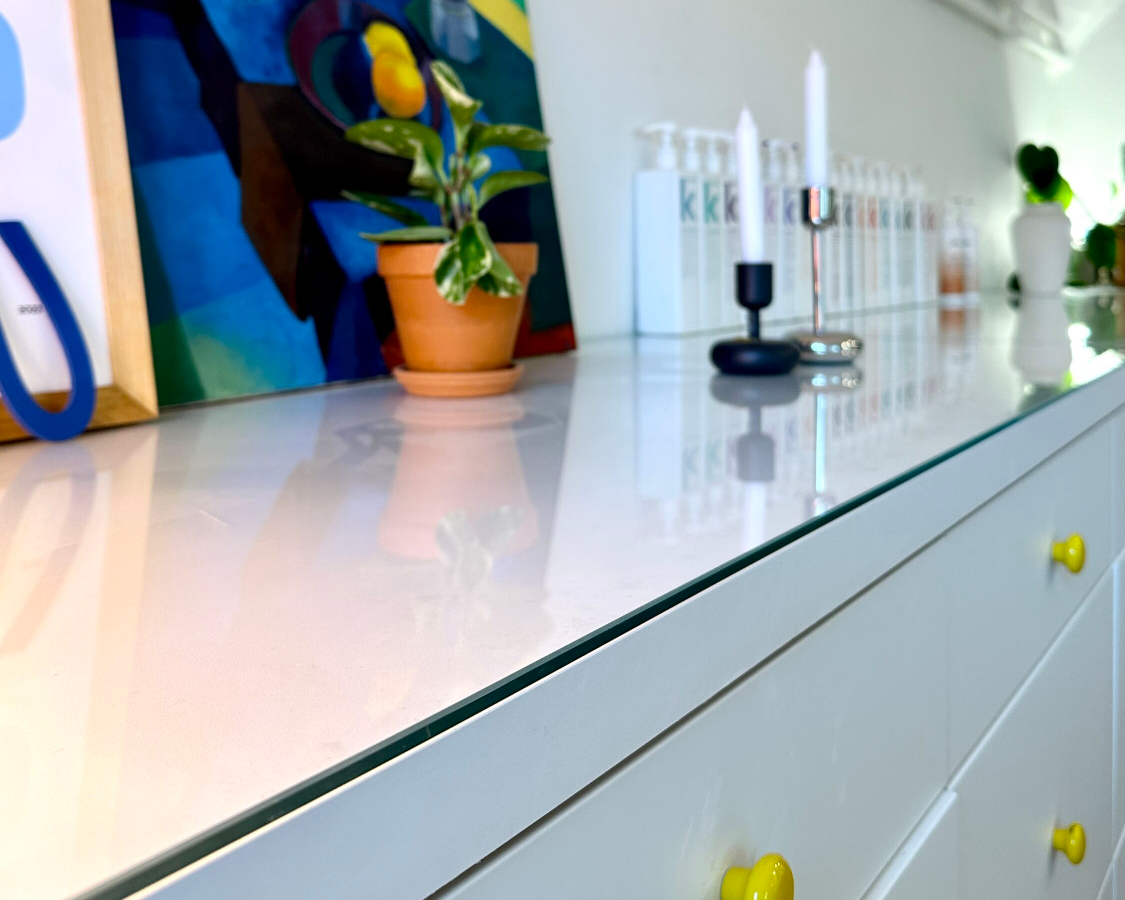 Suosittelemme tilaamaan lasin noin millimetrin pienempänä joka reunasta kuin pöytälevy. Näin mahdolliset iskut osuvat pöytään, eivät lasiin.