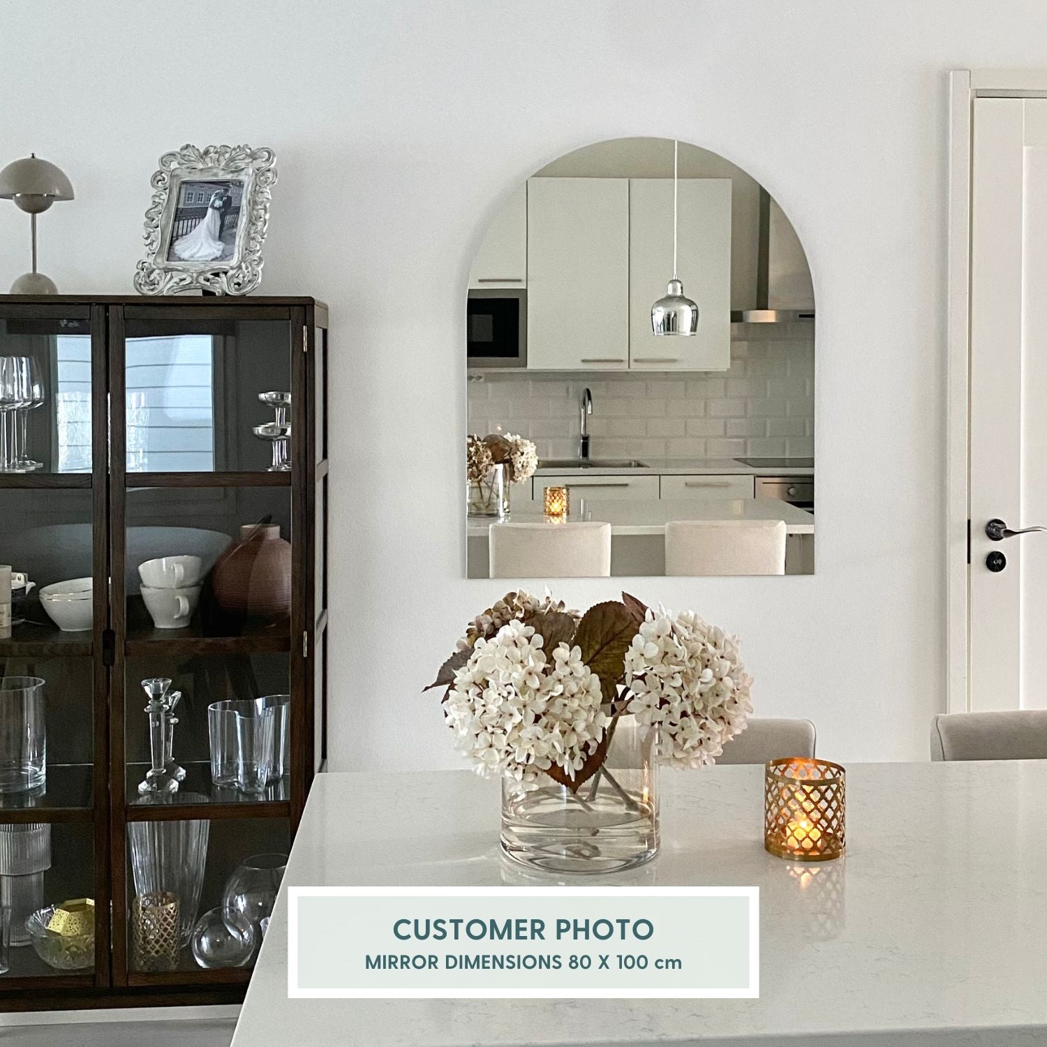 Lasitehdas valmistaa peilit käsityönä Porvoossa ja toimitamme niitä kaikkialle Suomessa. Vakiomittaisia Kaari-peilejä on useampia kokoja. Tämän peilin koko 80x100 cm sopii hyvin pieneen kylpyhuoneeseen tai sisustuselementiksi mihin tahansa huoneeseen.