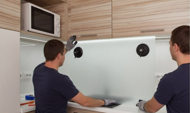 Liima levitetään pistemäisesti lasin taakse, ei koko lasin alueelle. Asennusvaiheessa laita 1–2 mm paksu koroke lasin alle, jotta se jää vähän irti keittiön tasosta. Kun liima on kuivunut, niin poista korokkeet ja tiivistä alareuna silikonilla.
