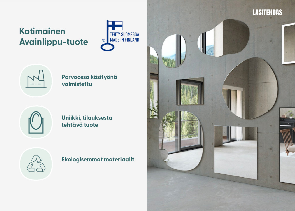 Kaikki tuotteemme valmistetaan huolellisesti käsityönä Porvoossa, kaikki materiaalit ovat korkealaatuisia ja peilit sekä sähköosat CE-merkittyjä. Meiltä voit tilata huoletta, sillä lähetyksemme ovat täysin vakuutettuja. Jos jotain sattuisi ja peili rikkoutuisi kuljetuksen aikana, niin lähetämme heti uuden peilin ja huolehdimme kaikista vakuutukseen liittyvistä paperitöistä. Lasitehdas valmistaa skandinaaviseen makuun sopivat sisustuspeilit sekä muut lasituotteet sisustukseen ja rakentamiseen.