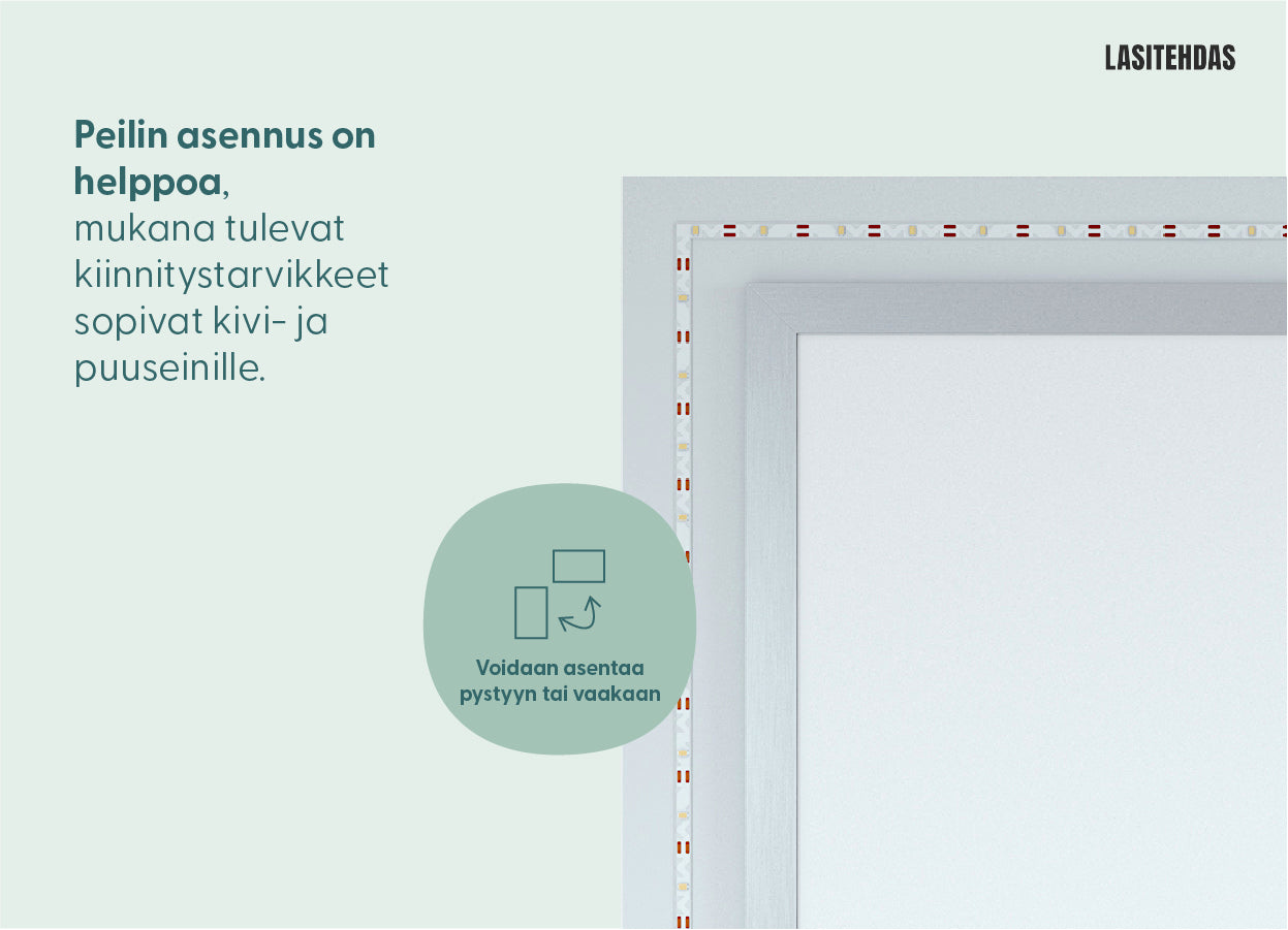 HUOM! Tämä peili tehdään aina tilauksesta ja valmistusaika on noin 8–13 arkipäivää. Peiliä saatavana myös mittatilauksena haluamassasi koossa samalla toimitusajalla.