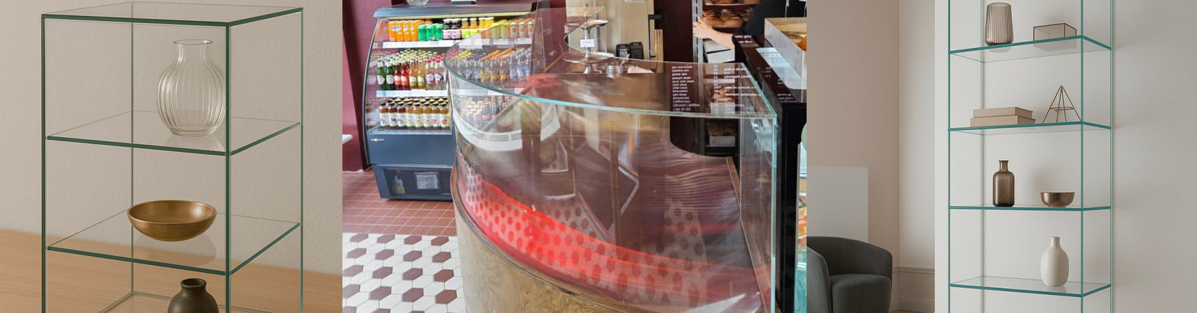 Valmistamme lasivitriinejä mittatilauksena. Lasit kiinnitetään toisiinsa näkymättömällä UV-liimalla. Liimaus on erittäin kova ja tyylikäs. Vitriinejä voi käyttää esimerkiksi kahviloissa tai näyttelyissä. Vitriineihin on saatavana myös saranaovia ja lukkoja.