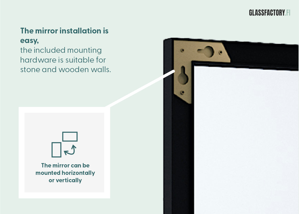 There are hanging hooks on the back of the mirror, so you can choose whether to hang it on the wall or place it on the floor. The mirror can be installed horizontally or vertically. The mirror’s thickness is 20 mm from outward, and the aluminum frame width is 7 mm on the mirror.