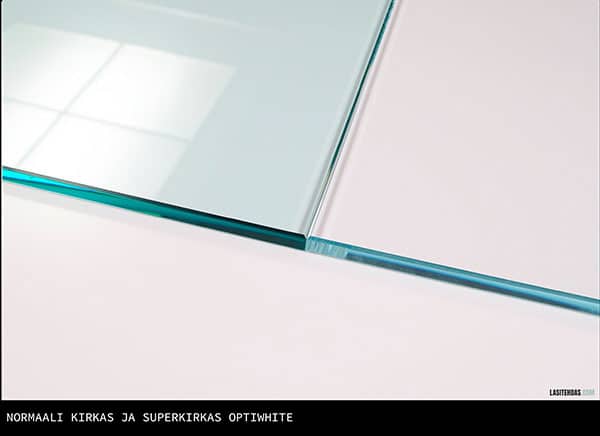 Vasemmalla normaali kirkas lasi jota käytetään esimerkiksi ikkunoissa, suihkuseinissä ja saunoissa. Jos lasi on valkoista taustaa vasten, niin siinä erottuu lasin luonnollinen vihreä sävy kuten mallikuvassa se erottuu jo korostetusti. Optiwhite (kutsutaan myös nimillä superkirkas tai rautavapaa) lasista on pyritty poistamaan mahdollisimman paljon rautaa, joka aiheuttaa vihreän värin. Lasin läpi katsottaessa se näyttää kirkkaalta, mutta valo taittaa reunoille niin, että ne vihertävät.