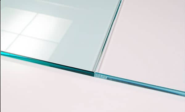 Vasemmalla tavallinen kirkas lasi ja oikealla Optiwhite lasi valkoista taustaa vasten.