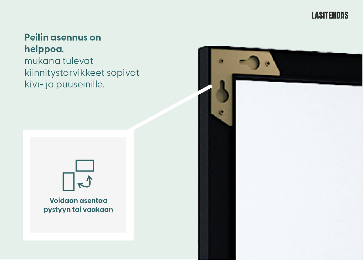 Peilin takana olevien ripustuskoukkujen ansiosta voit kiinnittää sen seinälle vaivattomasti. Mustakehyksinen seinäpeili on täydellinen lisäys mihin tahansa tilaan, joka kaipaa häivähdyksen tyylikkyyttä ja käytännöllisyyttä. Aitta-peili ei ainoastaan heijasta kauneuttasi, vaan tuo myös tilaan valoisan ja avaran vaikutelman tilaasi. Voit sijoittaa sen makuuhuoneeseen, eteiseen tai olohuoneeseen antamaan huoneellesi uuden ulottuvuuden sekä luomaan viimeistellyn ilmeen.