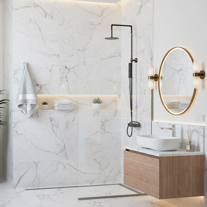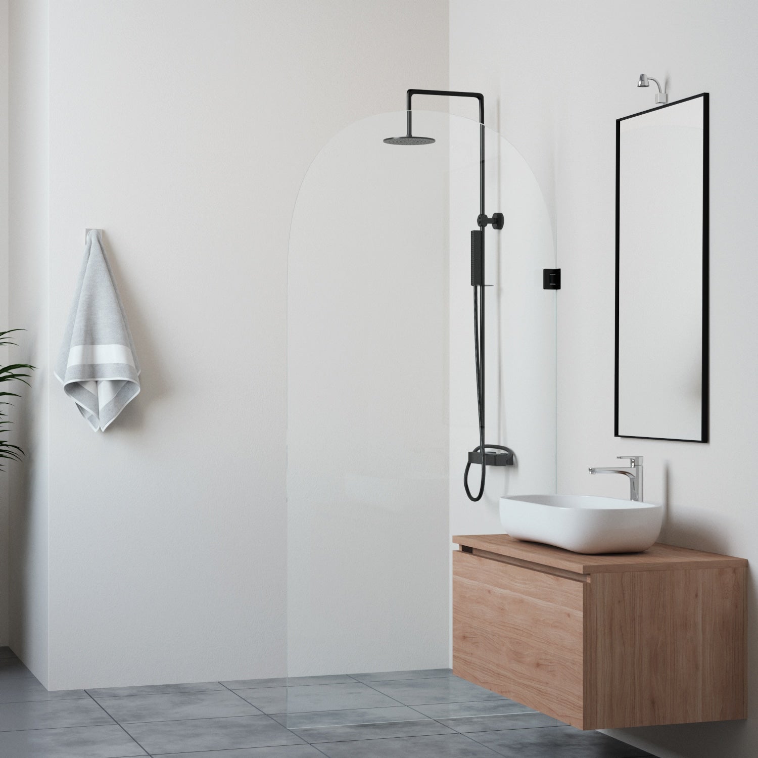 Kaari-suihkuseinä erottuu kauniilla kaarevalla yläosallaan ja antaa kylpyhuoneelle yksilöllisen ilmeen. Kääntyvä rakenne tekee siitä käytännöllisen, ja sen voi toteuttaa myös kiinteänä versiona jolloin seinä kiinnitetään U-listoilla seinään ja lattiaan.