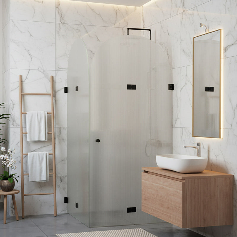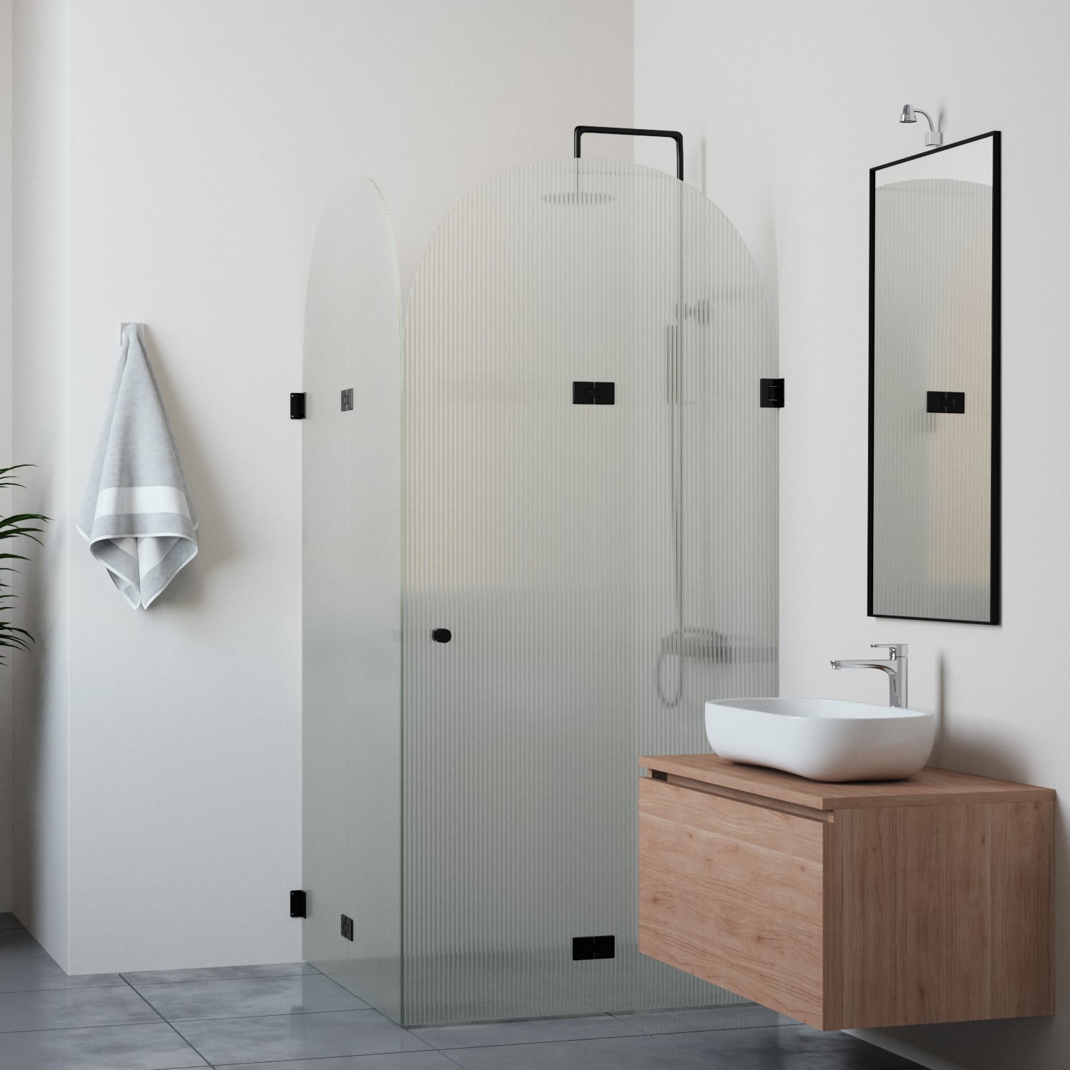 Kaarre-suihkuseinä erottuu kauniilla puolikaaren muodollaan ja tuo tilaan uniikin ilmeen. Taittuvat ovet tekevät ratkaisusta käytännöllisen – ovet saa käännettyä nipuksi seinän viereen, jolloin kylpyhuoneen tilat ovat vapaasti käytettävissä.