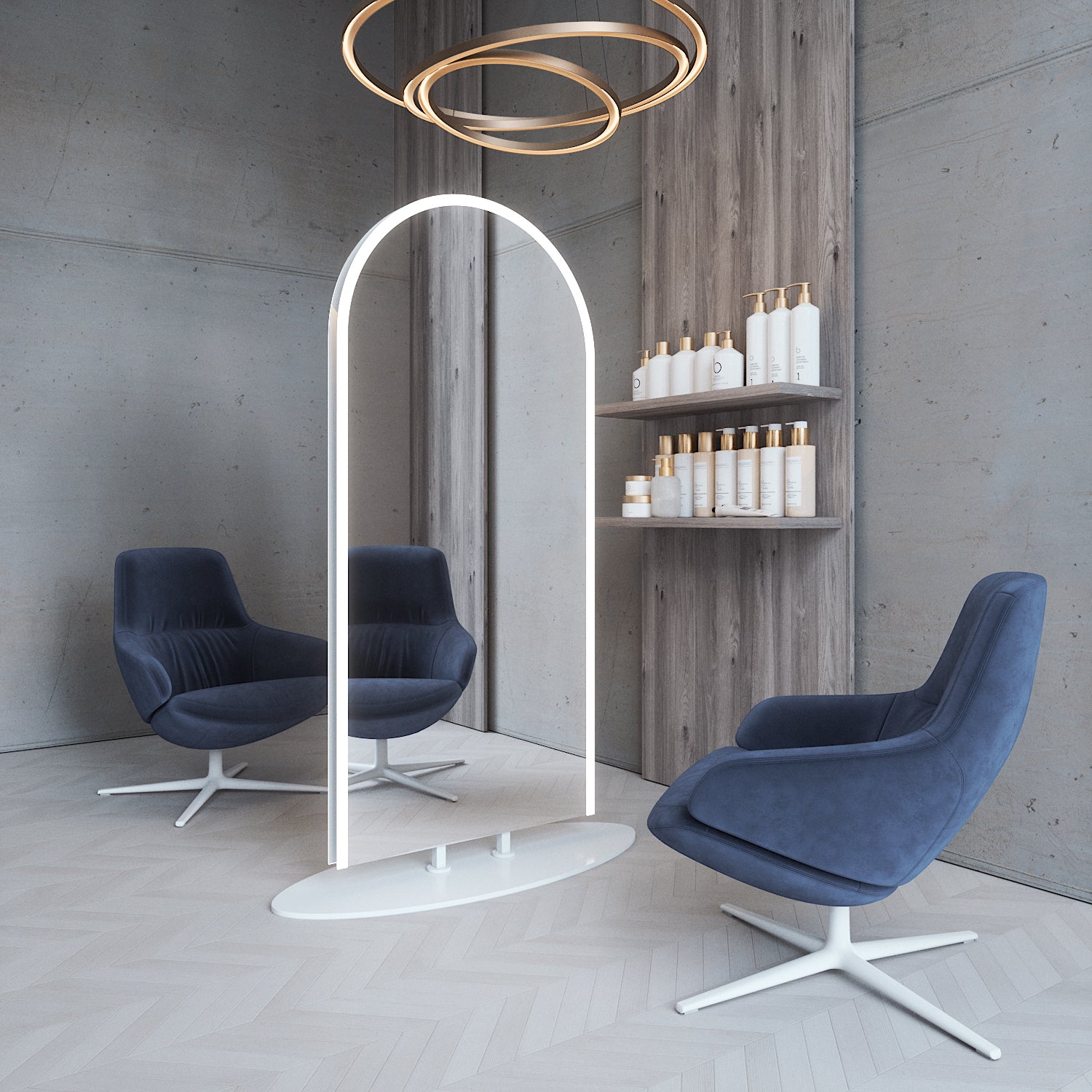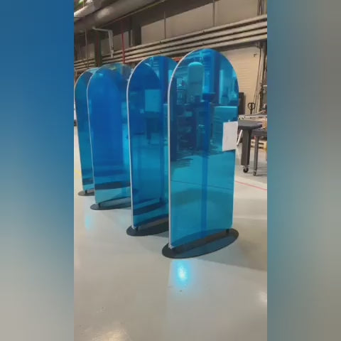 Kaksiosainen lattialla seisova peili on luotu erityisesti kampaamoita ajatellen. Sen sijoittaminen tilaan onnistuu vapaasti ja peili seisoo tukevalla ja painavalla metallisella jalustalla. Tämän jalallisen peilin voit joustavasti asettaa minne vain ja saat tehtyä helposti kaksi asiakaspaikkaa, yksi peilin molemmille puolille.