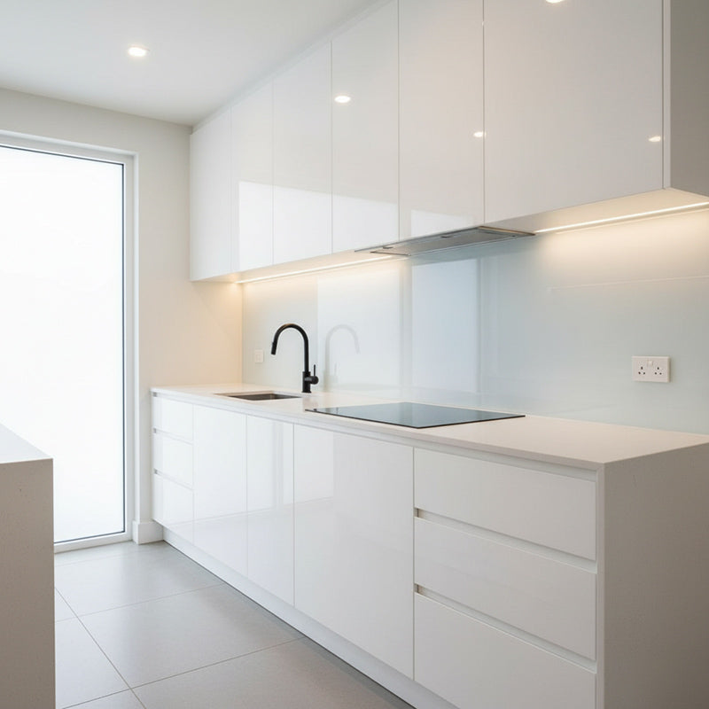 Keittiön välitilan lasi on tyylikäs ja käytännöllinen vaihtoehto perinteisille laatoille. Lasi on helppo pitää puhtaana ja tekee keittiöstä valoisan ja modernin. Suosituin väri on puhdas valkoinen, mutta lähes kaikki muutkin sävyt ovat tilauksesta saatavana.