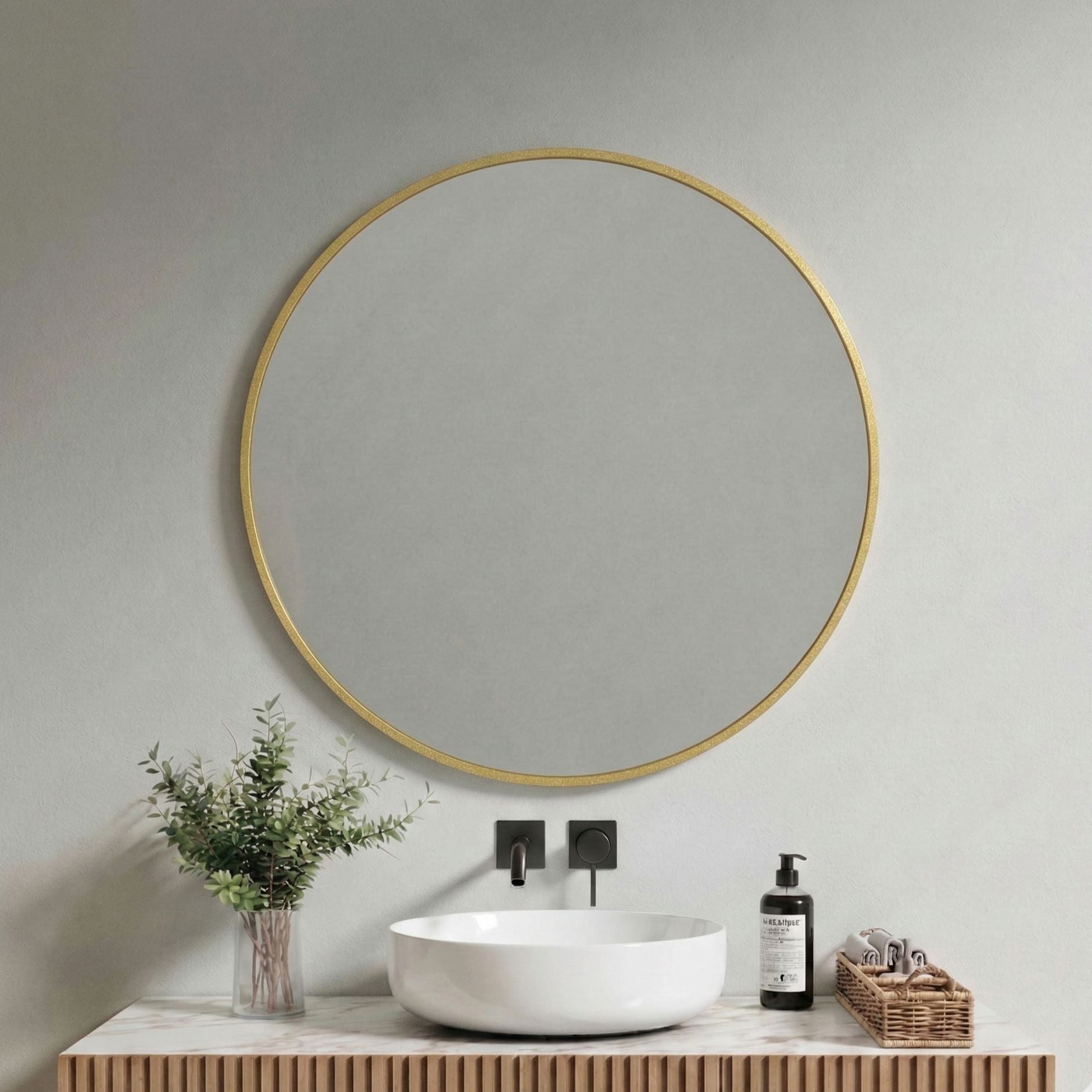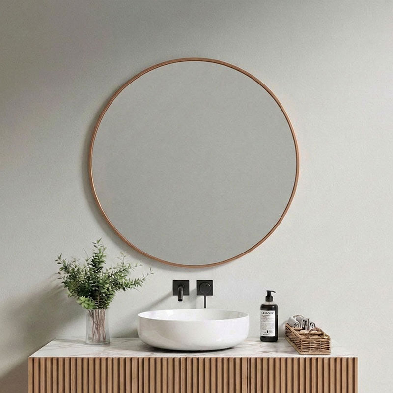 Pyöreä peili on yksi sisustuksen klassikoista. Sen pehmeä muoto tuo tilaan tasapainoa ja avaruutta sekä heijastaa valoa kauniisti ympäristöönsä. Siro alumiinikehys korostaa peilin muotoa ilman raskasta ilmettä.