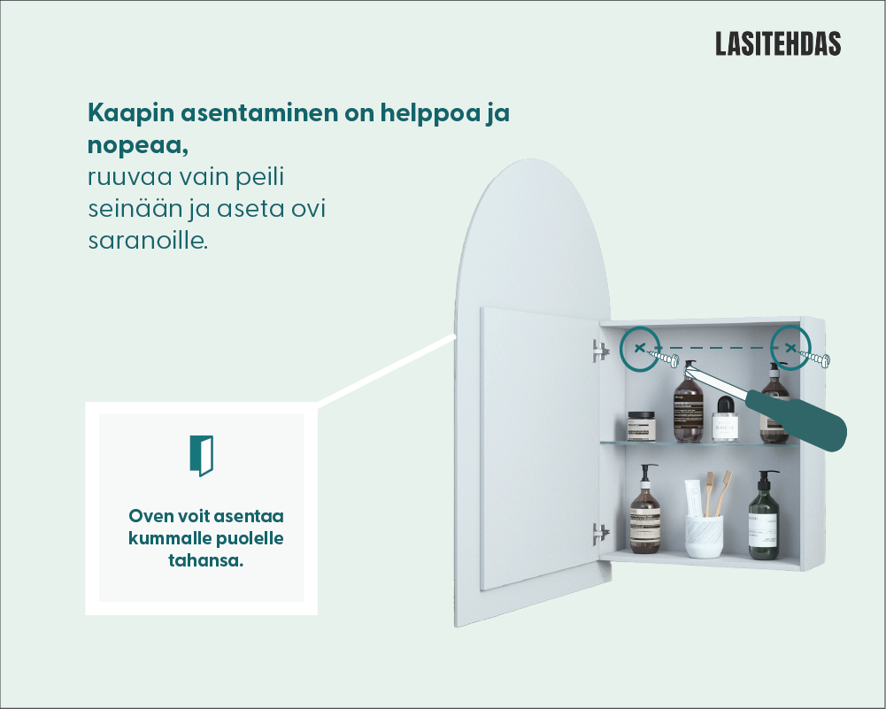 Peilikaappi toimitetaan valmiiksi koottuna, vain ovi kiinnitetään saranoille sen jälkeen kun runko on asennettu seinälle.