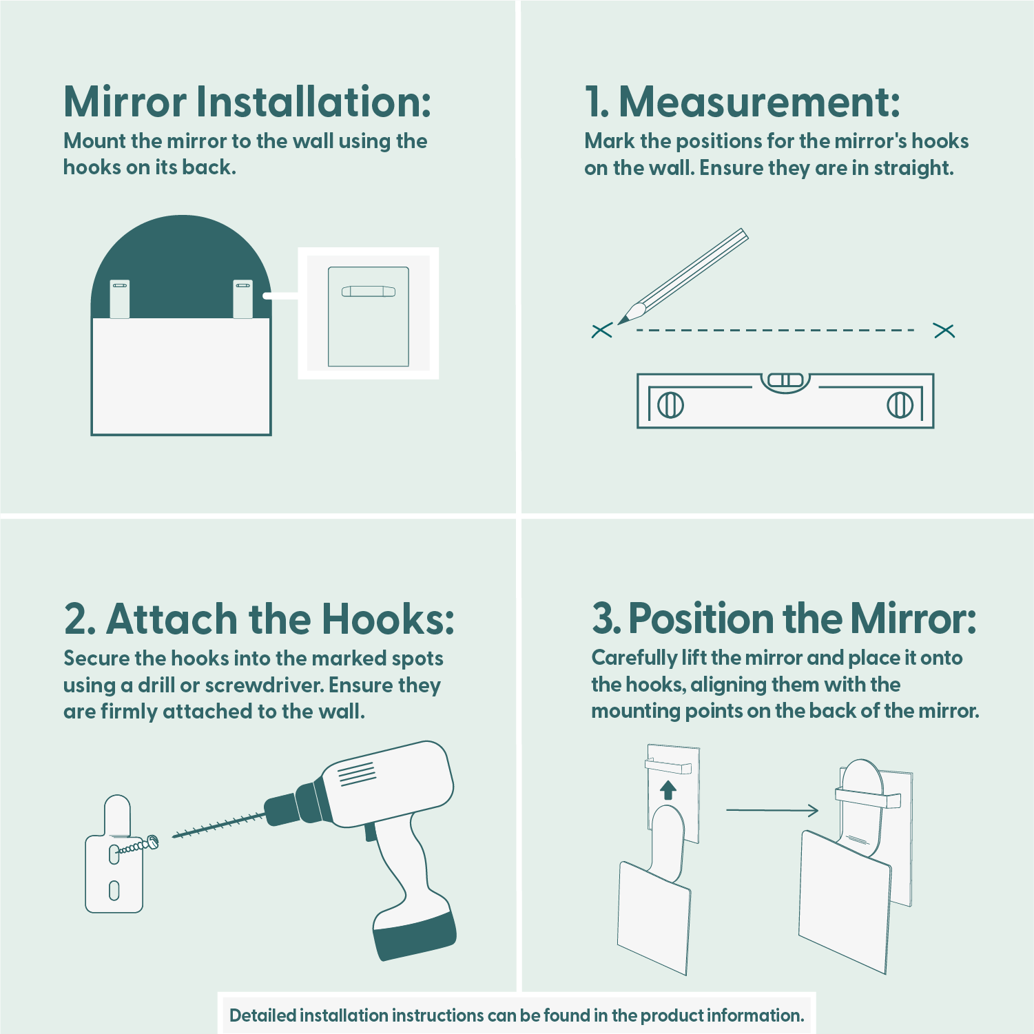 Valitessasi koukut, lisäämme peilin mukaan kaksi kappaletta koukkuja. Koukuissa on valmis tarrapinta ja ne painetaan peiliin haluttuun kohtaan. Paina koukkua 15 sekuntia peiliä vasten ja odota tämän jälkeen 30 minuuttia että koukun liima on kuivunut. Toimituksen mukana on myös ruuvit seinäkiinnitystä varten. Ruuvit soveltuvat kiviseinään ja puurakenteeseen. Jos kiinnität peilin muuhun materiaaliin, esimerkiksi kipsilevyyn niin hanki sopivat kiinnikkeet seinän mukaan rautakaupasta. Koukkuihin sopii 3,5mm paksu ruuvi.