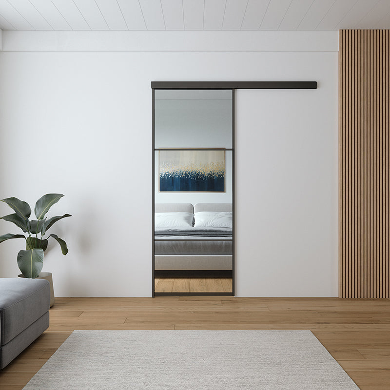 Mustilla, valkoisilla, messingin-, pronssin- tai kuparinvärisillä metallikehyksillä toteutettu Frame Laine -liukuovi on sisustuksen näyttävä katseenvangitsija.