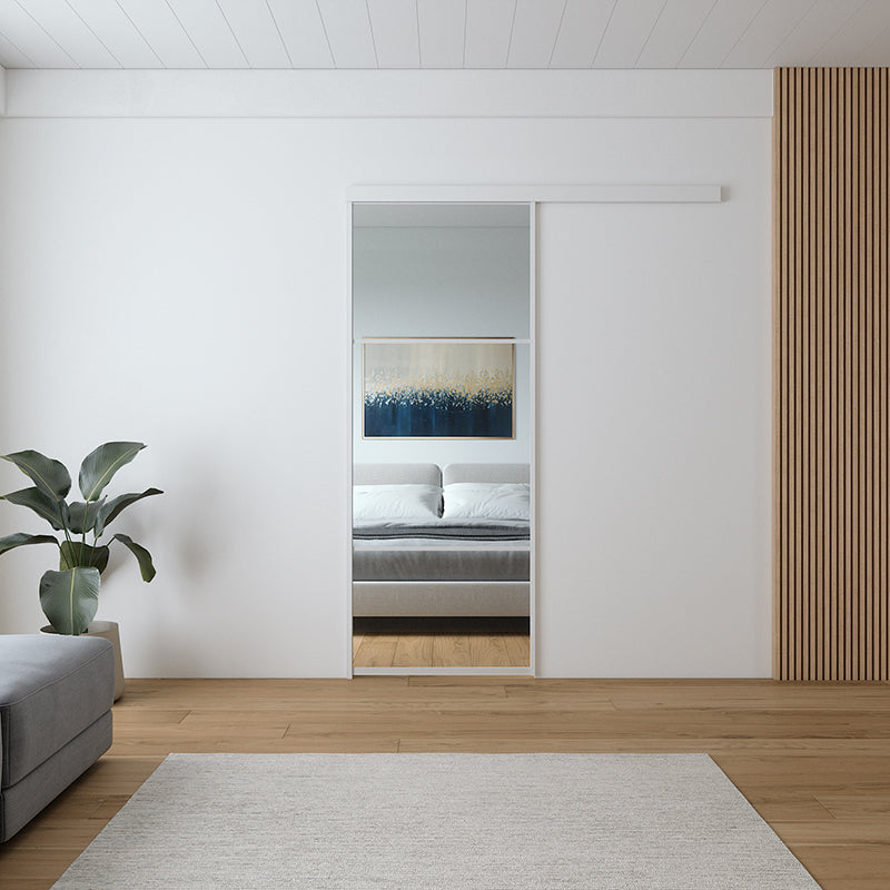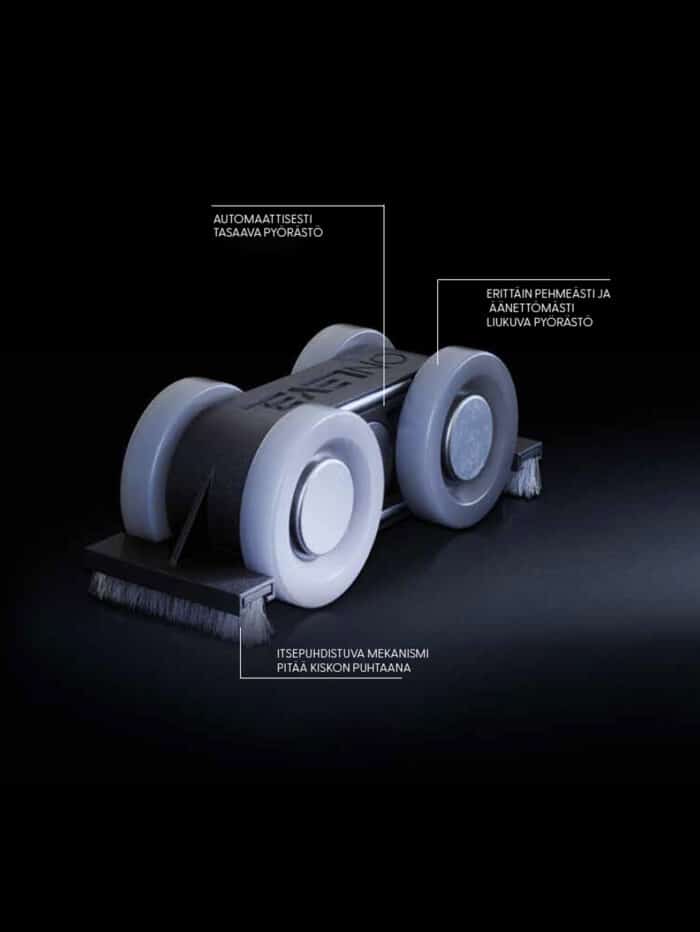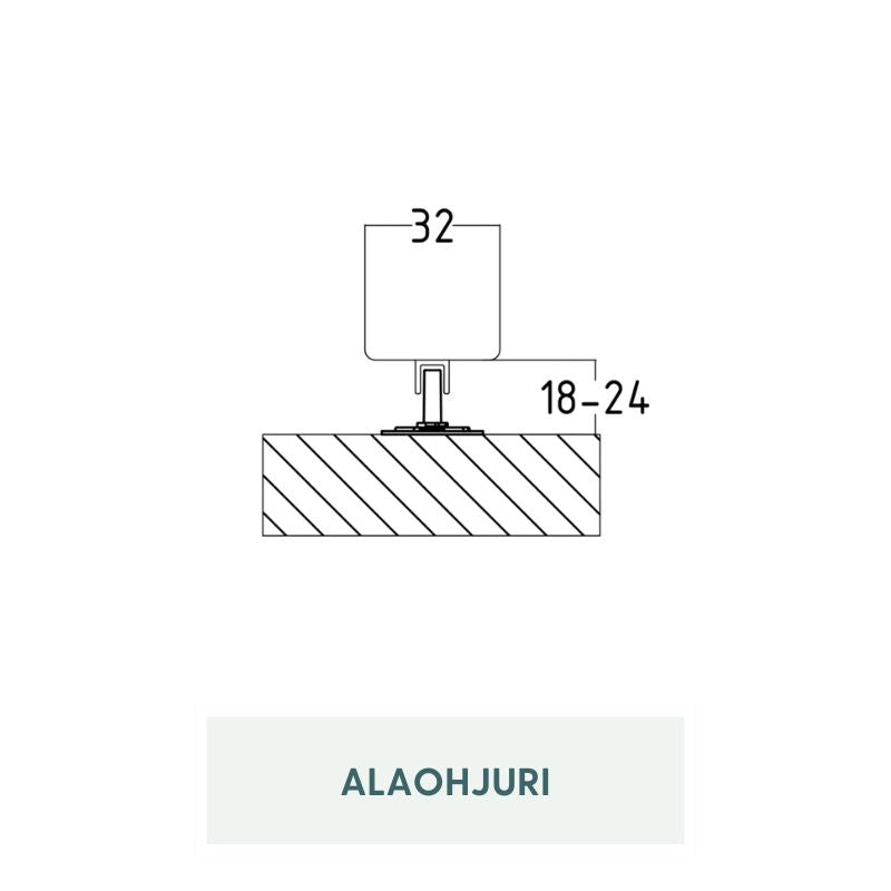 Väliovi liukuovena, asennetaan seinän päälle. Ovessa on laadukkaat hidastimet molempiin suuntiin. Ovi on yläkantoinen, eli lattiassa ei ole kiskoa, ainoastaan pieni ohjuri oven sisällä lattiassa. Yläkantoinen ovi on tyylikäs ja viimeistelty kokonaisuus ja sitä on saatavana usealla eri ovityypillä.