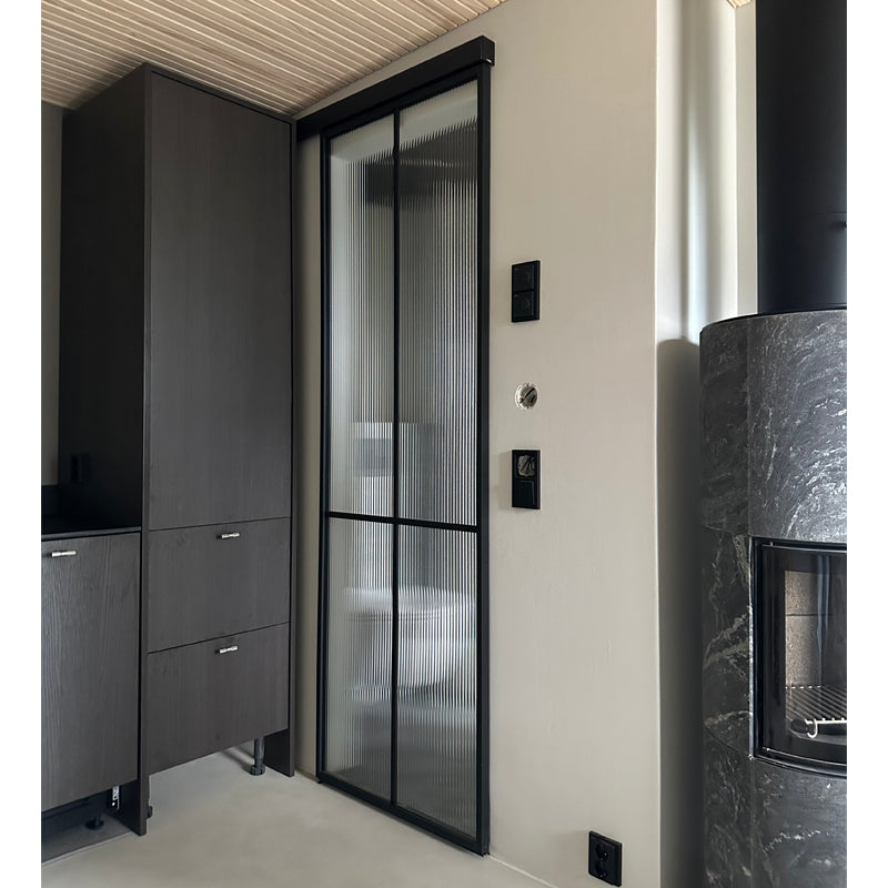 Kaikki ruudukko-ovet ja -seinät ovat saatavilla myös raitalasilla! Raidallinen lasi on trendikäs valinta, joka antaa näkösuojaa, mutta päästää valon läpi. Raitalasia voi hyödyntää myös suihkuseinissä ja muissa sisustustuotteissa.