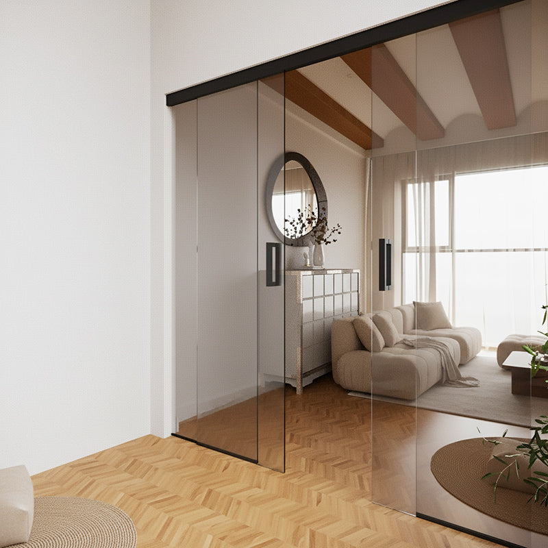 Valo Aava on näyttävä ja avara tilanjakoratkaisu, jossa yhdistyvät kaksi liukuovea ja kaksi kiinteää lasia. Kehyksetön lasiovi päästää valon virtaamaan esteettä, ja moderni design tekee siitä täydellisen sisustuselementin niin kotiin kuin toimistoon.