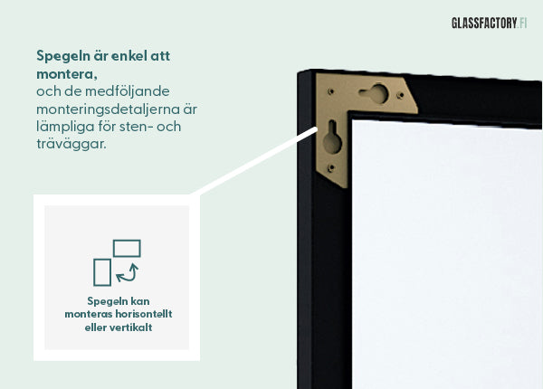 På spegelns baksida finns upphängningskrokar så att du kan välja om du vill hänga upp den på väggen eller ställa den på golvet. Spegeln kan installeras horisontellt eller vertikalt. Spegelns tjocklek är 20 mm från utsidan och ramens bredd är 7 mm på spegeln.