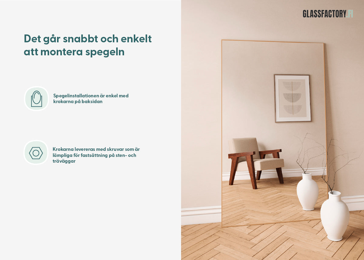 OBS! Spegeln tillverkas alltid på beställning och produktionstiden är 8–13 arbetsdagar. Anpassade storlekar är också möjliga.